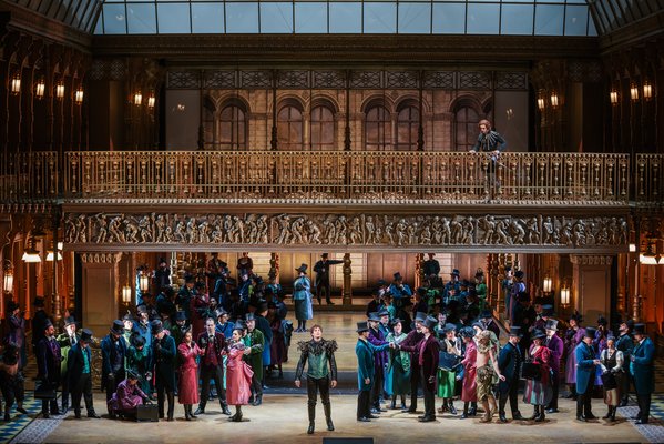 "Director András Almási-Tóth and his team’s lavishly cinematic staging opted out of a medieval setting, and instead placed the story in a late Victorian Era public building which functioned as a community gathering space. (...) Budapest’s version of this opera might qualify to be in the top ten largest and most opulent productions of Lohengrin ever created inside an opera house. The enormous chorus was well over 100 people, including a generous number of children. Sebastian Hannak’s sumptuous set and lighting design took us back into the Gilded Age of sculpted wooden architecture and men with tall hats and canes, and women with satin dresses adorned with bustles; whereas, the costumes (all designed by Krisztina Lisztopád) for the medieval male characters were resplendent capes, knee-high silver boots, and saber holders, imbuing them with a dream-fantasy quality."